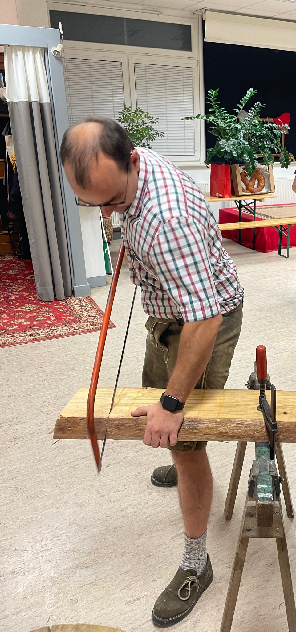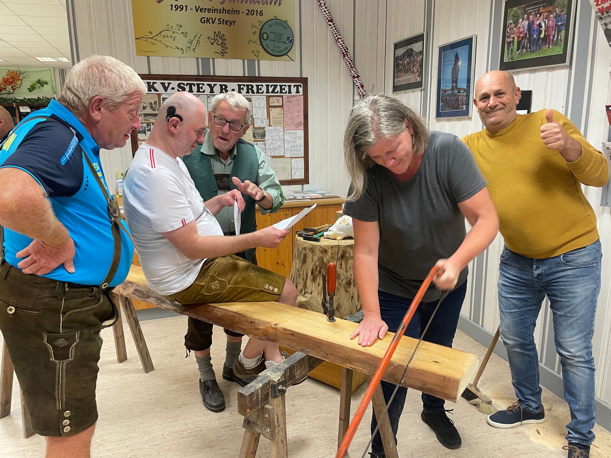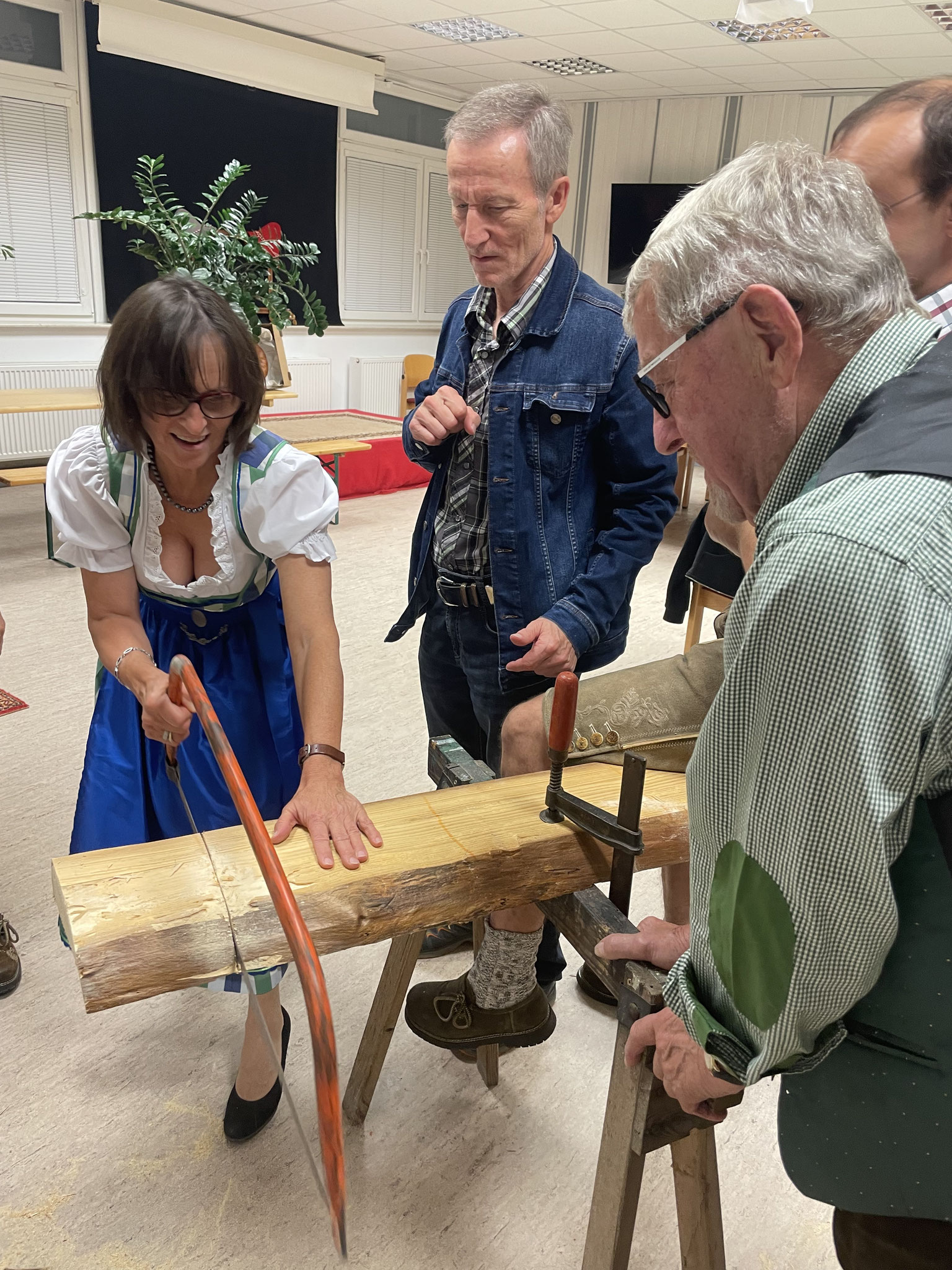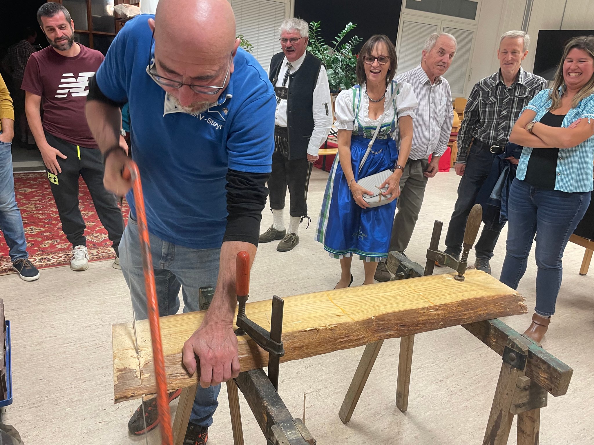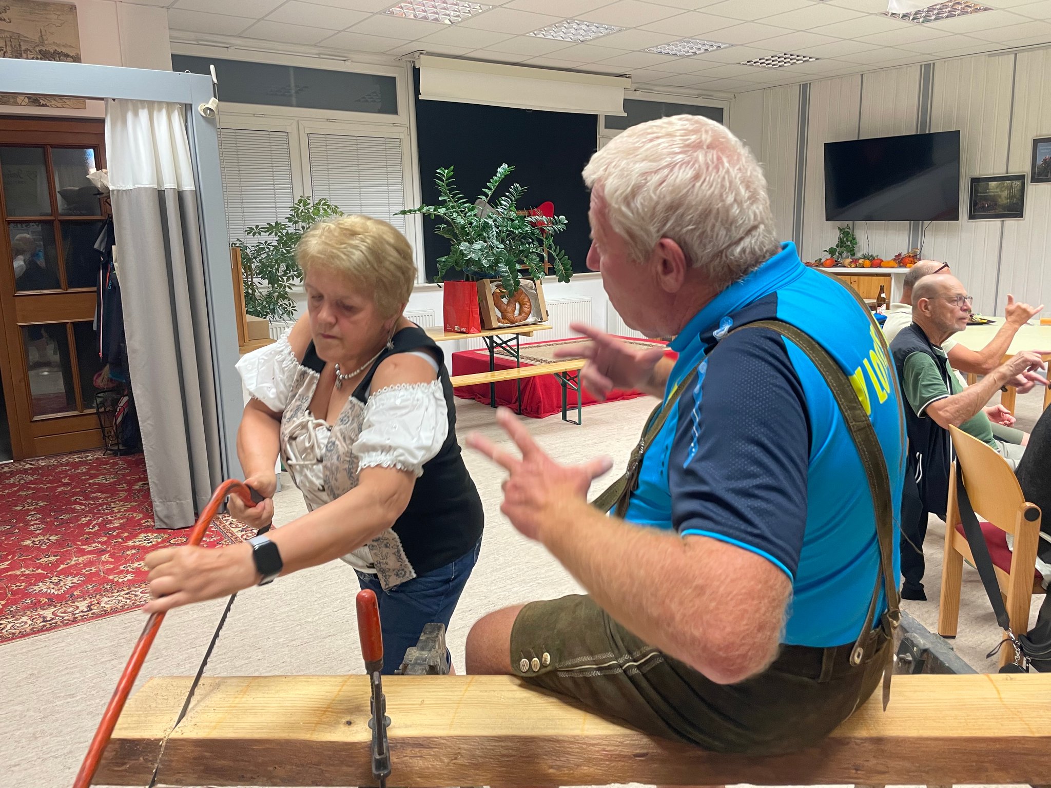 Am Samstag, dem 27. September 2025 fand bei strahlendem Herbstwetter ab 15 Uhr unser Herbstfest im Vereinsheim in Steyr statt. Die ersten Gehörlosen kamen sogar schon gegen 14 Uhr und verbrachten die erste Zeit, teilweise auch draußen, mit Kaffee und Mehlspeisen, sowie neuerdings auch mit Bauernkrapfen. Renate Hofer und Doris Leibetseder waren wieder fleißig in der Küche, sodass es Weißwürste mit Brezel und Käsekrainer mit Kartoffelsalat zur Auswahl gab. Es wurden Tombola-Lose für verschiedene Sachpreise durch Stefanie Samwald verkauft, welche aufgrund der hohen Nachfrage alle ausverkauft wurden – es durften sich viele der Besucher über die tollen Gewinne freuen. Es gab auch andere lustige und klassische Aktivitäten, wie Nagelhämmern in den Holzstamm oder ein Stück Holz um die Wette sägen, wobei jeweils die schnellsten 3 Männer und die 3 schnellsten Frauen beim Sägen einen Geldpreis gewinnen konnten. Um 21 Uhr gab es dann für alle Anwesenden in Tracht (18 Personen) einen Schnaps und Waffeln als Geschenk. Bis in die späten Nachtstunden wurde der Abend bei guter Stimmung verbracht, bis die letzten der insgesamt ca. 60 Besucher die Heimreise anbrachen.
