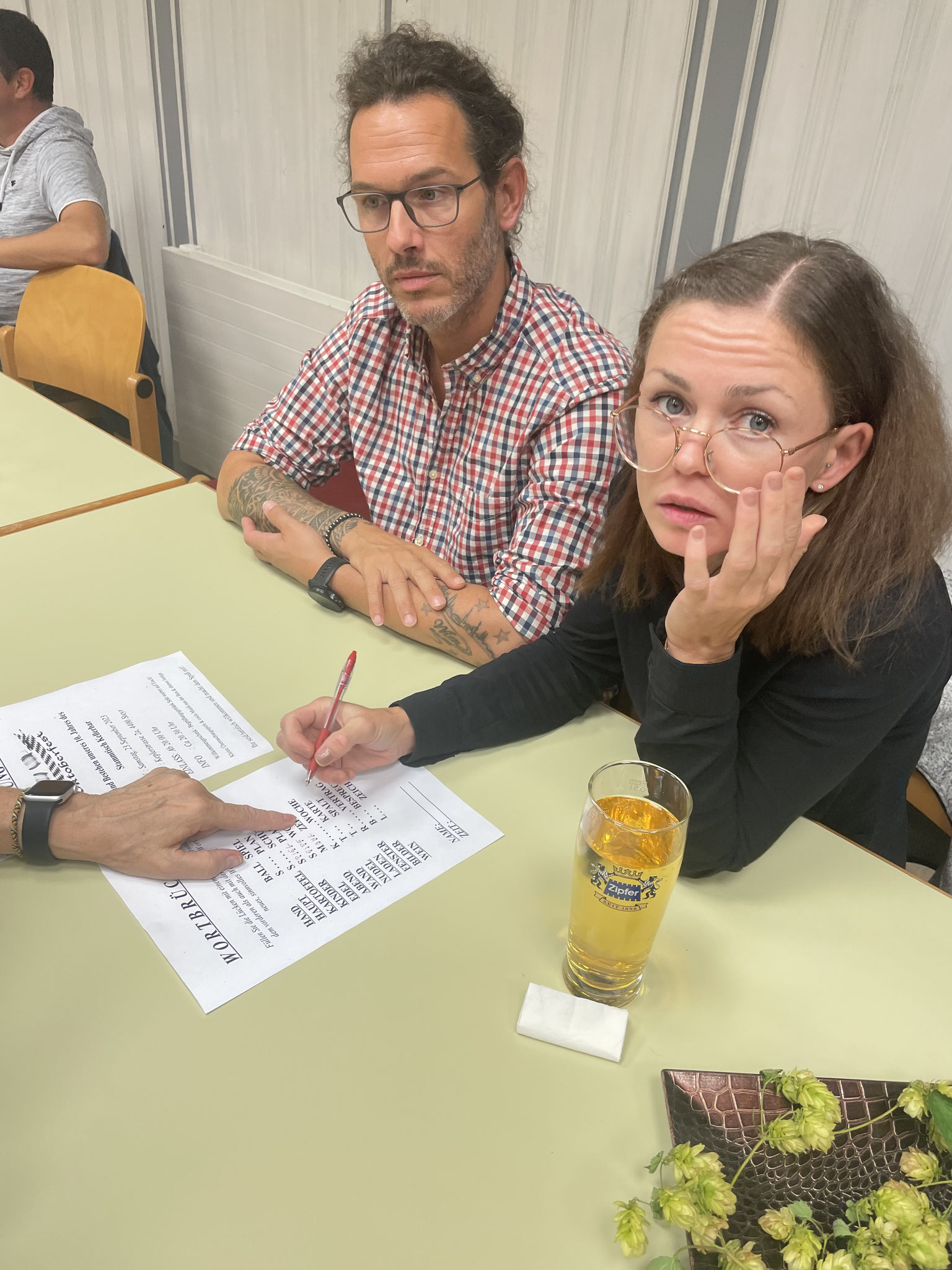 Danach spielten 7 Teilnehmer noch „Wortbrücken“, bei dem schwierige Wortkombinationen gefunden werden mussten. Alle Teilnehmenden erhielten als Gewinn einen kostenlosen Schuss Schnaps.
