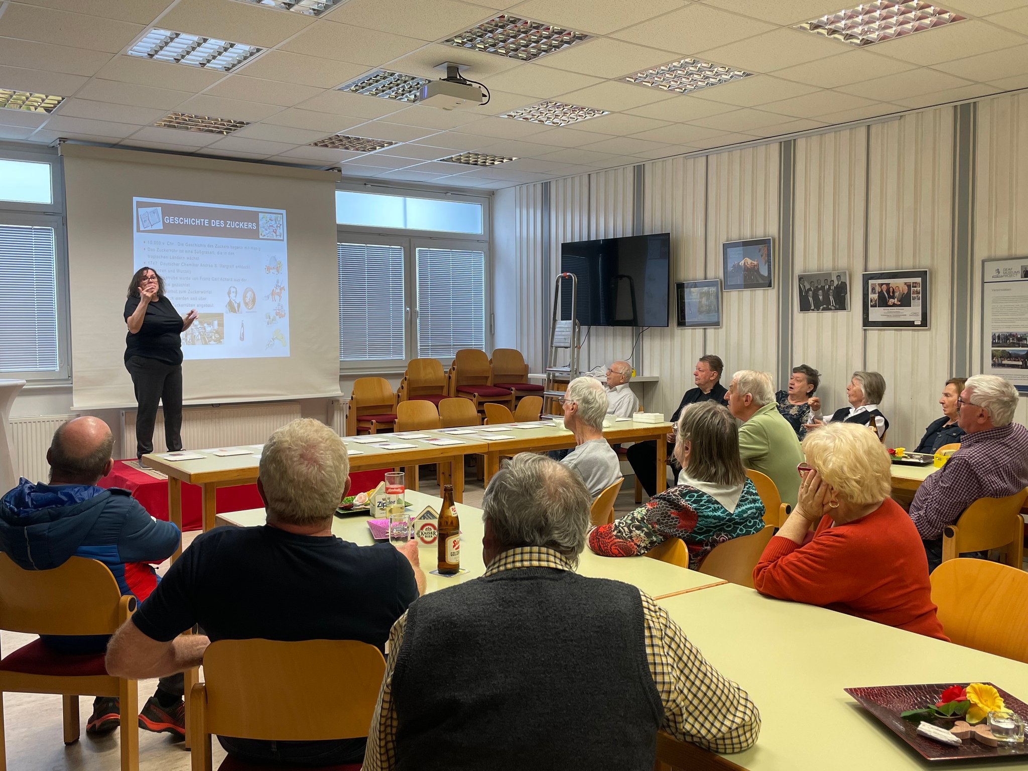 Am 4.4. kamen 46 Teilnehmer/innen in unseren Vereinsheim. Annemarie Mayrhofer (gl.) hat einen tollen Vortrag über Versteckter Zucker in Lebensmittel & Schutz vor Hitze gemacht. Anfangs erzählte sie die Geschichte des Zuckers, wie er sich den Jahren entwickelt hat. Es gab dazwischen auch verschiedene Meinungen zum Austausch u. es wurden viele Fragen von Gehörlosen gestellt. Zum Schluss bekamen alle Bilder mit Lebensmitteln. Jeder sollte sich überlegen u. vorstellen, wie drinnen sind. Dann könnt wieder über Thema „Was tun bei Hitze?“ Die Vortragenden waren gut vorbereiten u. man kannte ihnen an, dass sie viel Erfahrung bei dem Vortrag haben. Sie berichteten über die Tätigkeiten des Glv. Der beiden Vortrag war sehr spannend, obwohl dieser knapp 2 Std. dauerte.