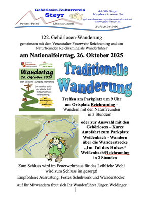 Gelungene Wanderveranstaltung mit dem Veranstalter Feuerwehr Reichraming und den Naturfreunden Reichraming unter bewölktem Himmel. 18 Gehörlosen nahmen die flotte Wanderung mit den Hörenden in großer Anzahl unter. Start in Reichraming – Zügiges Wandern entlang der Enns bis zur Ennsbrücke unterhalb des Rohrgrabens, dann querend zur anderen Ennsseite - steil emporsteigend über Rigltal zum versteckenden Kronstein mit traumhafter Aussicht in Nähe und Ferne. Noch höher steigend zur Labstelle. Langer Abstieg über den bäuerlichen Güterweg zum Ziel Feuerwehrhaus in Reichraming. In voller Zufriedenheit!